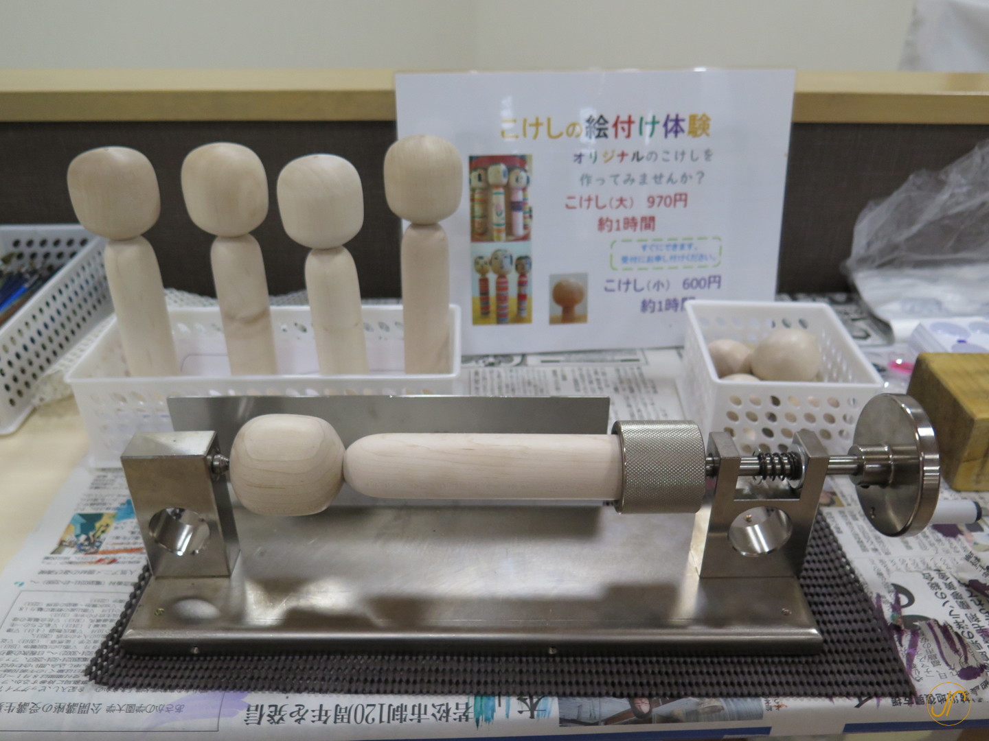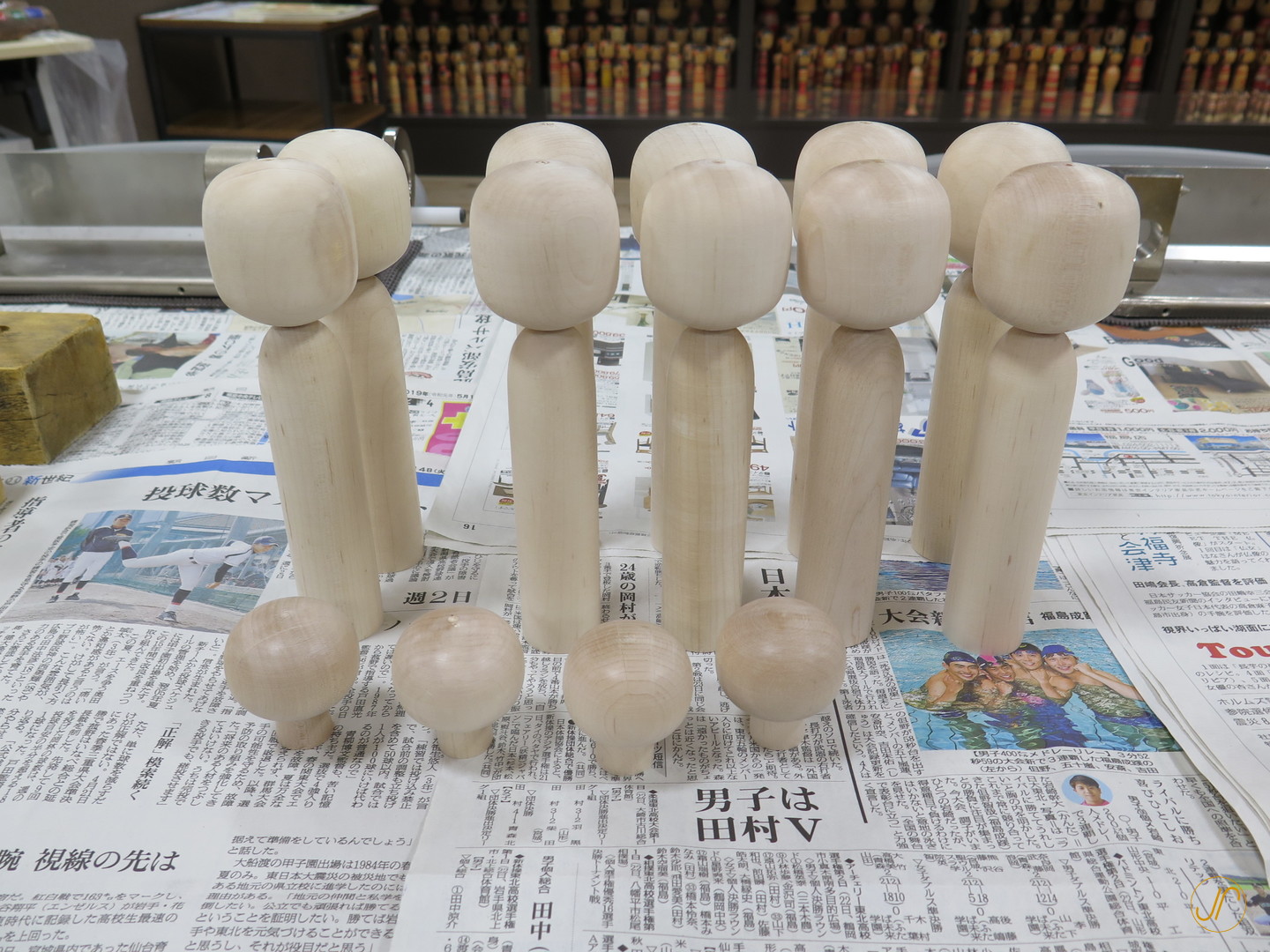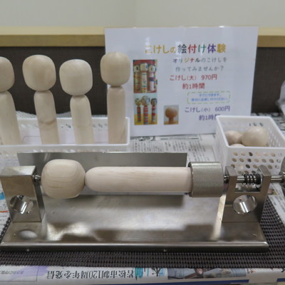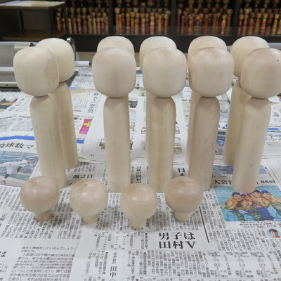Mit Holz, typischerweise von dunklen Kirsche oder dem leichteren Mizuki-Baum, dreht und schneidet der Kokeshi-Handwerker die Puppe auf einer Drehbank und poliert sie zu einem feinen Finish. Der Kopf und der Körper werden im Allgemeinen getrennt gedreht und dann zusammengefügt. Der Kokeshi-Handwerker malt dann von Hand, das Gesicht und das Kimono-Muster auf die Puppe.